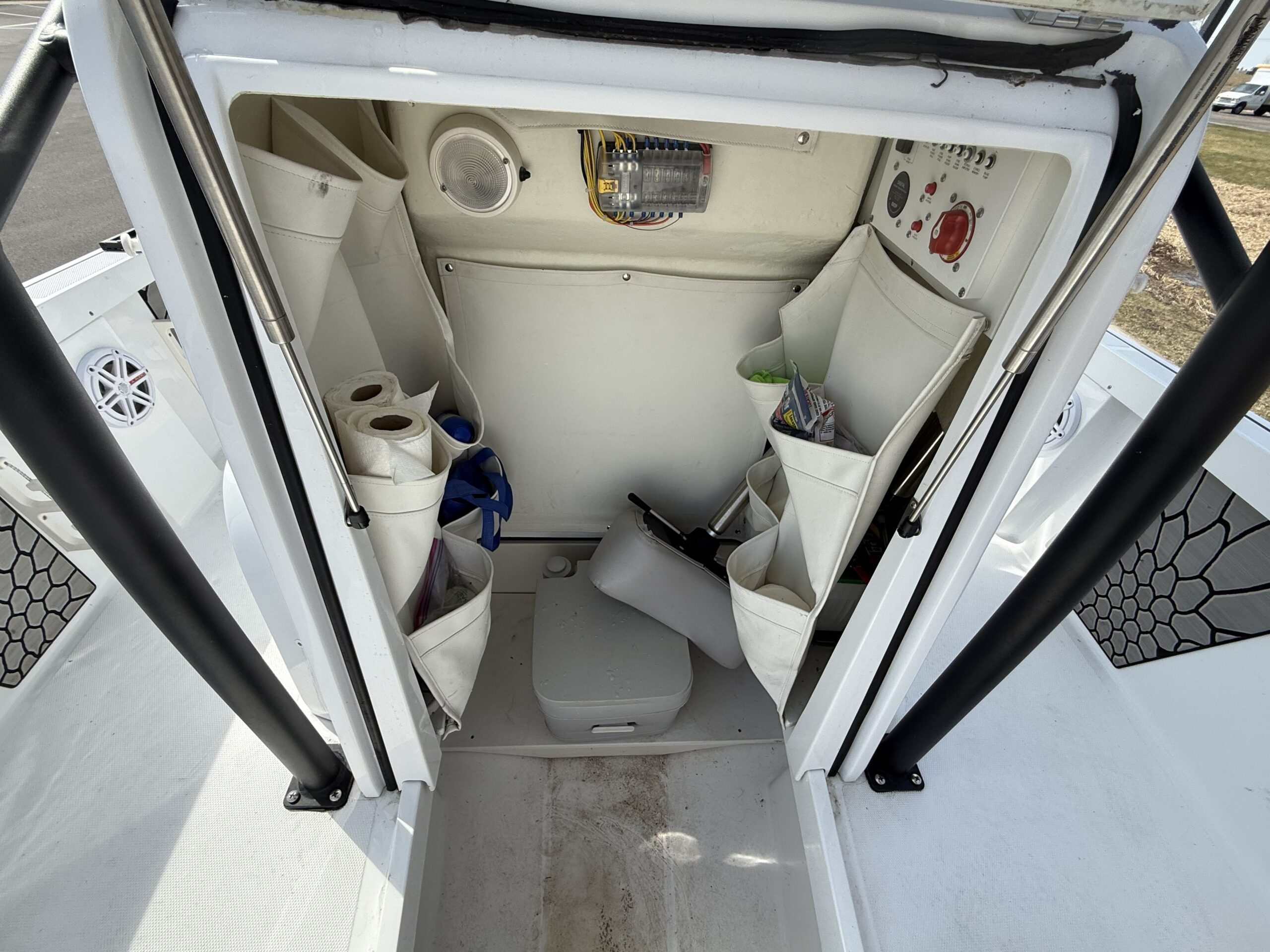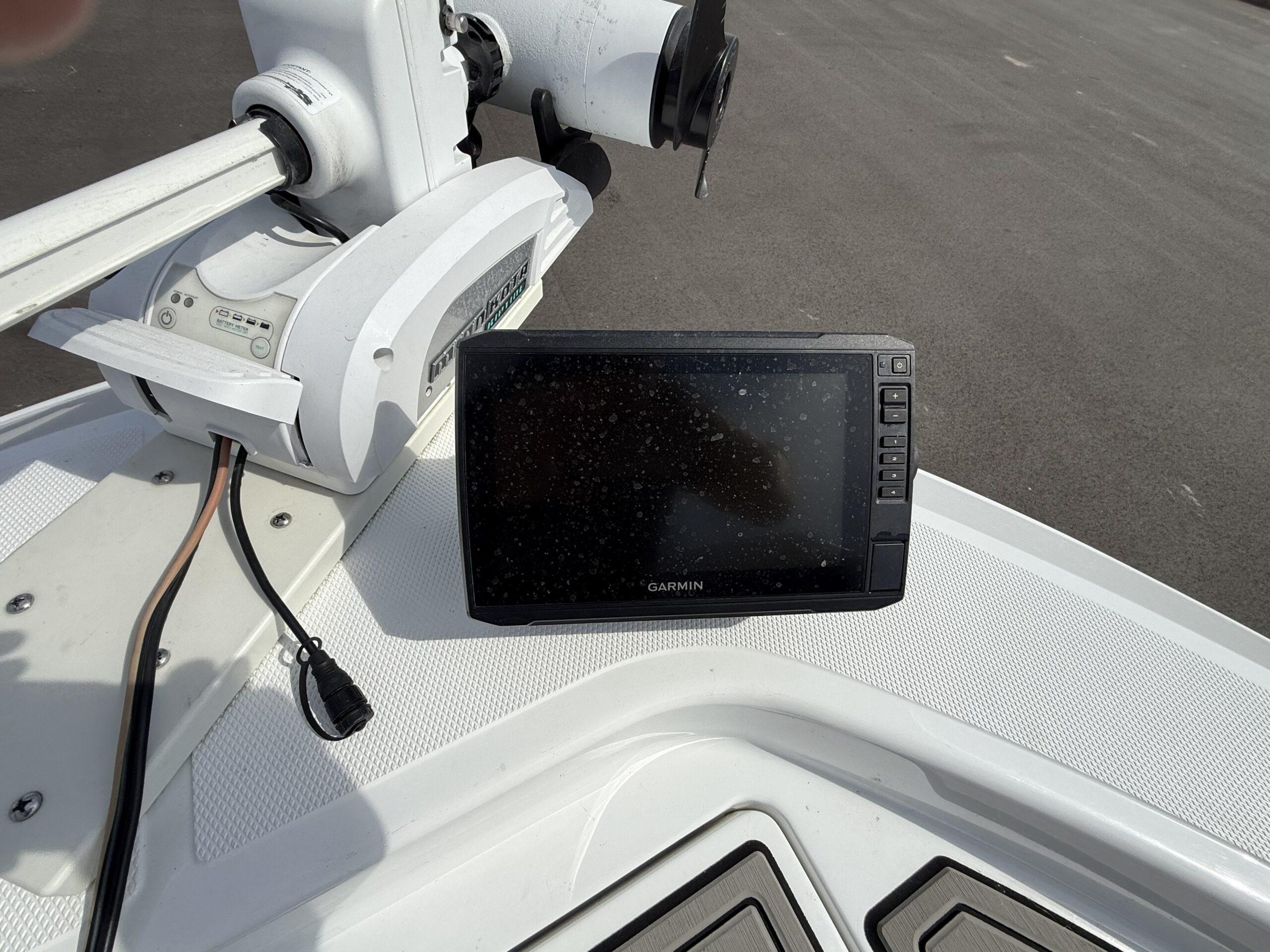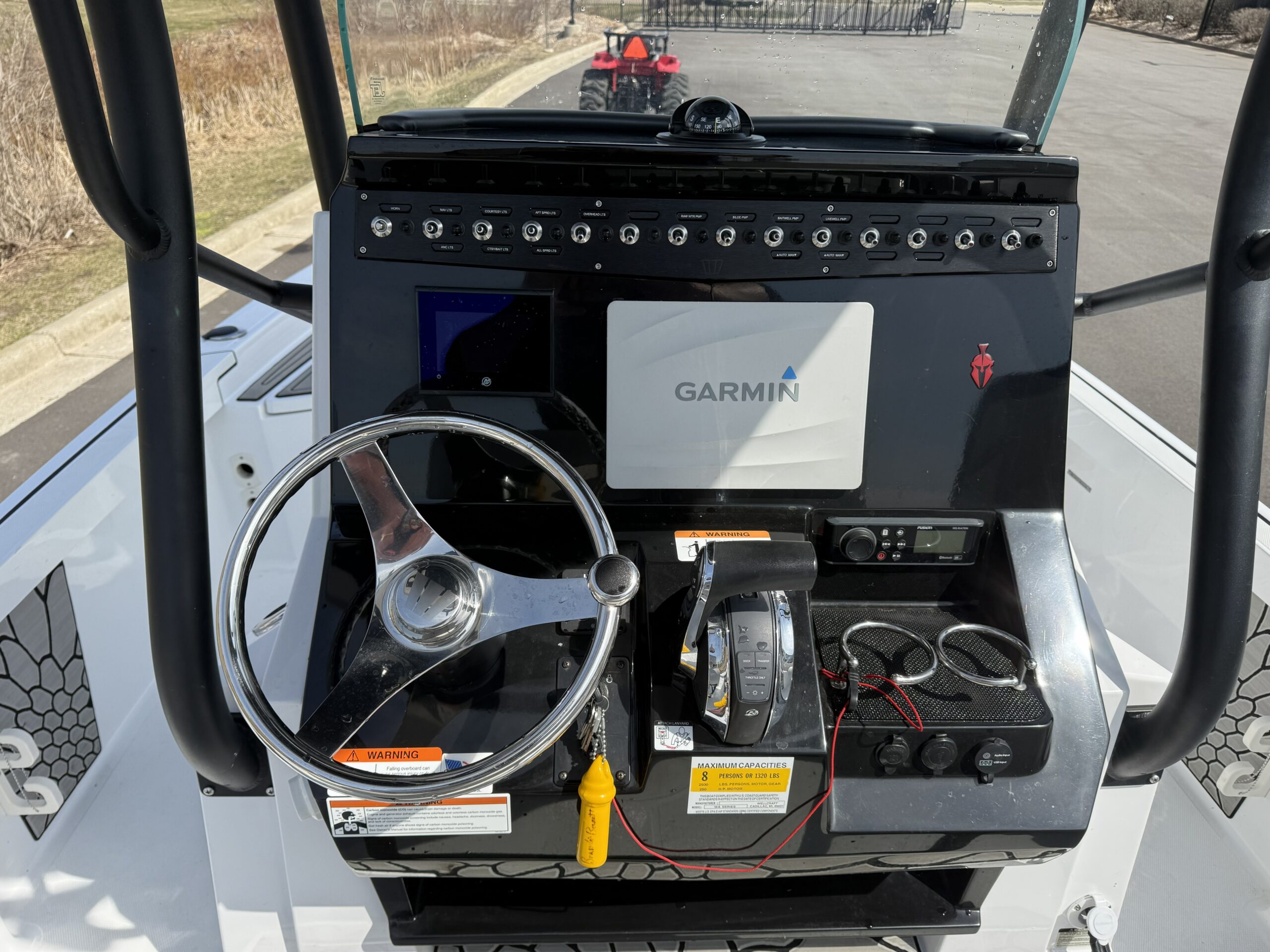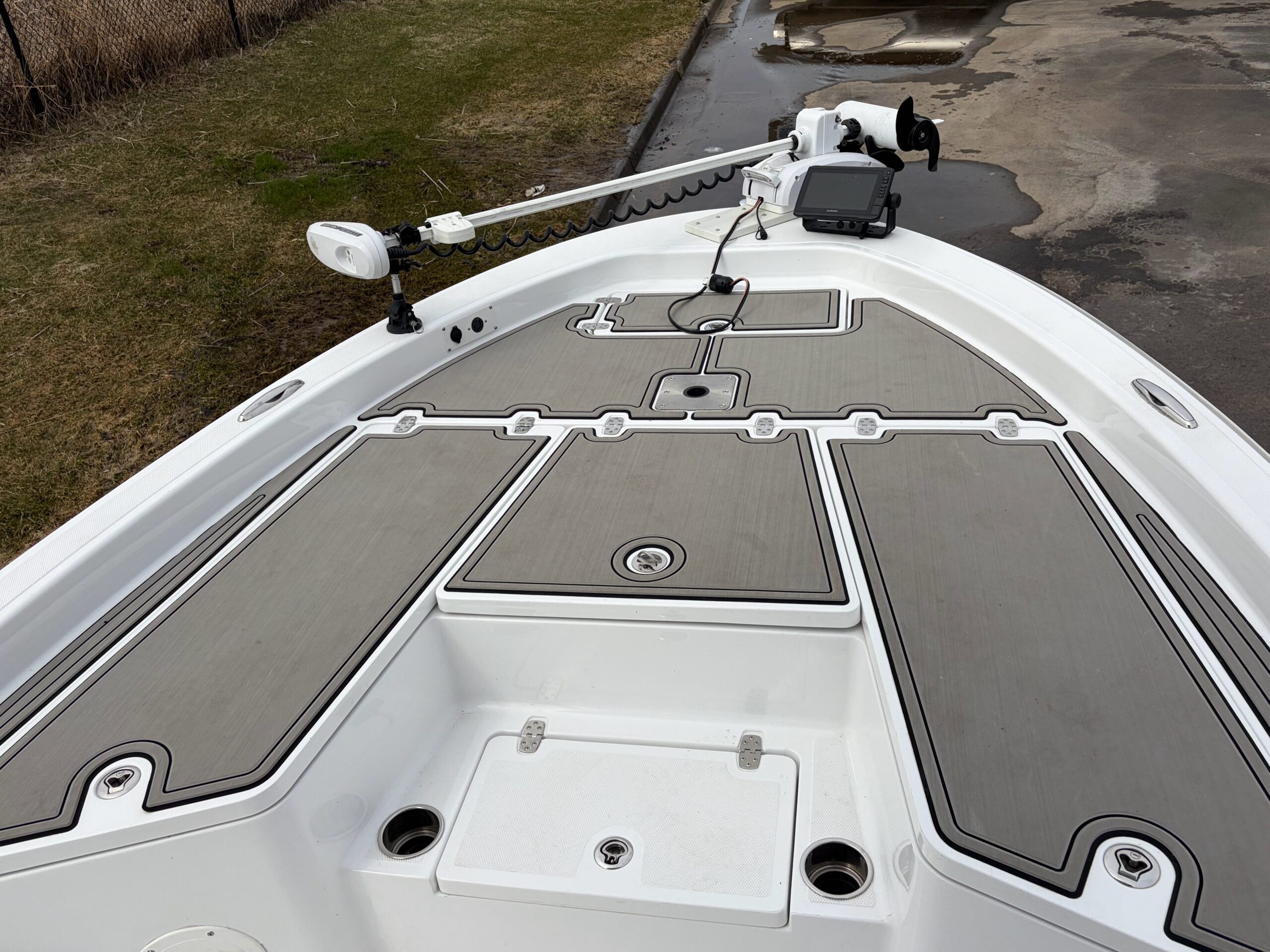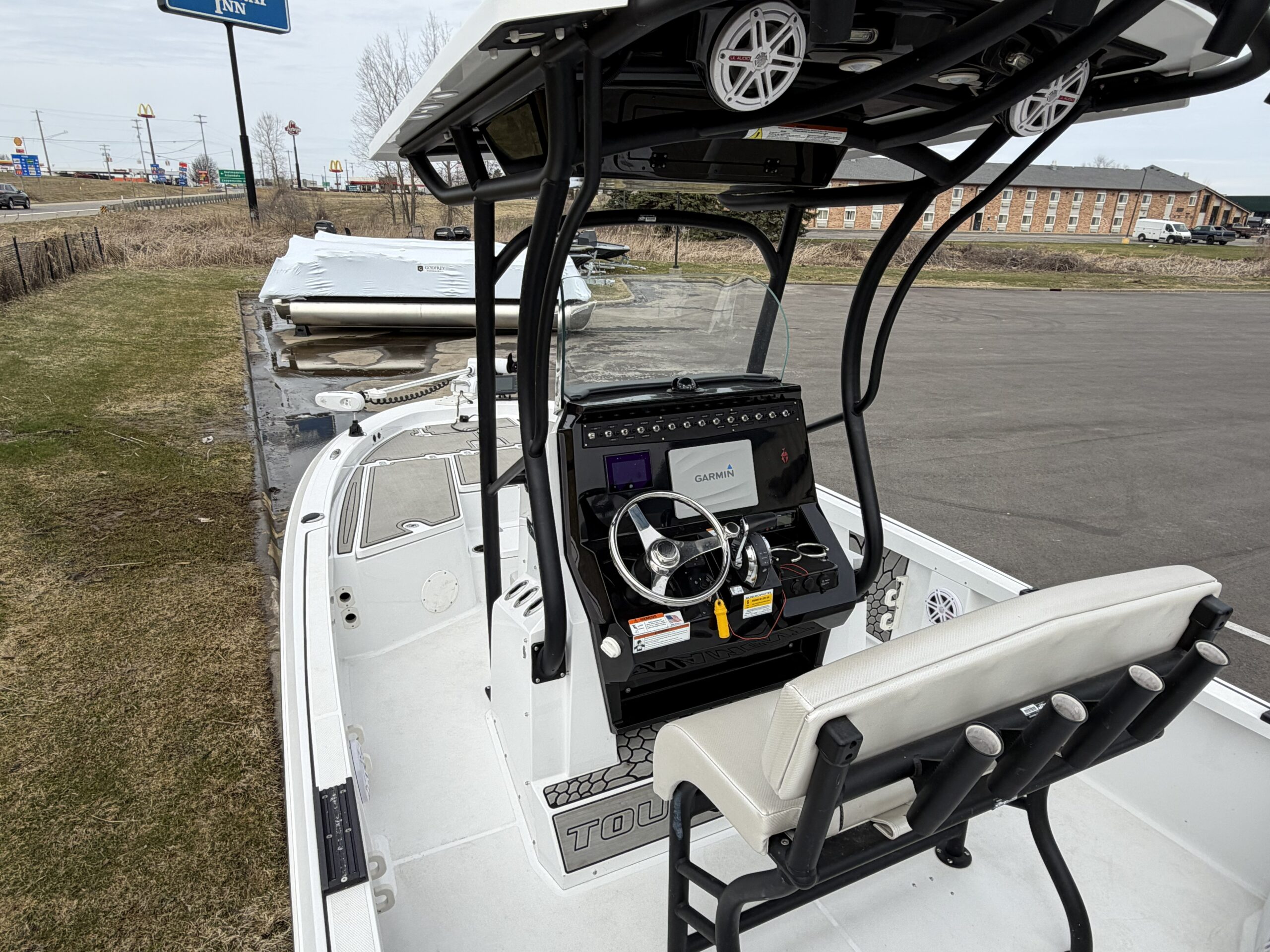 Features include Garmin graphs at helm & bow, MinnKota trolling motor, battery charger, 2 livewells, custom deck mats in the bow, upgraded speakers in the tower, autopilot, compass, flip up stern seat, and custom 2 piece cover.