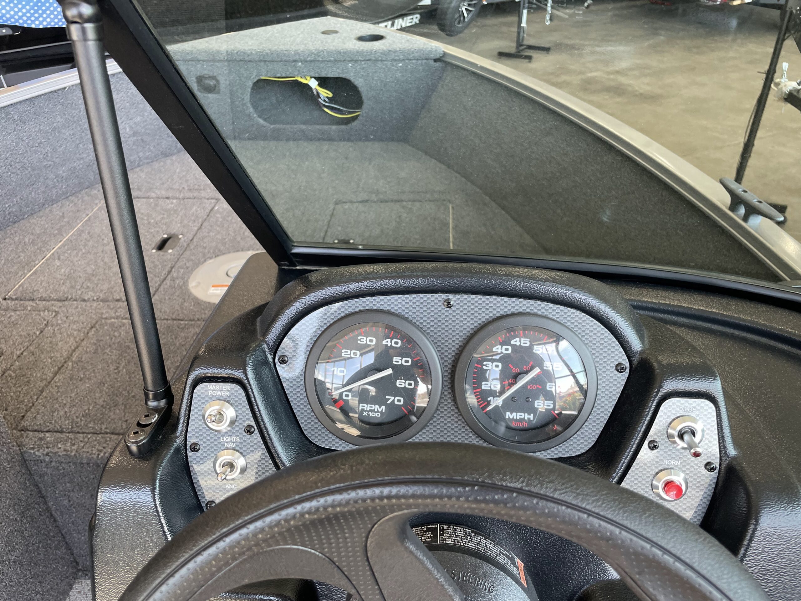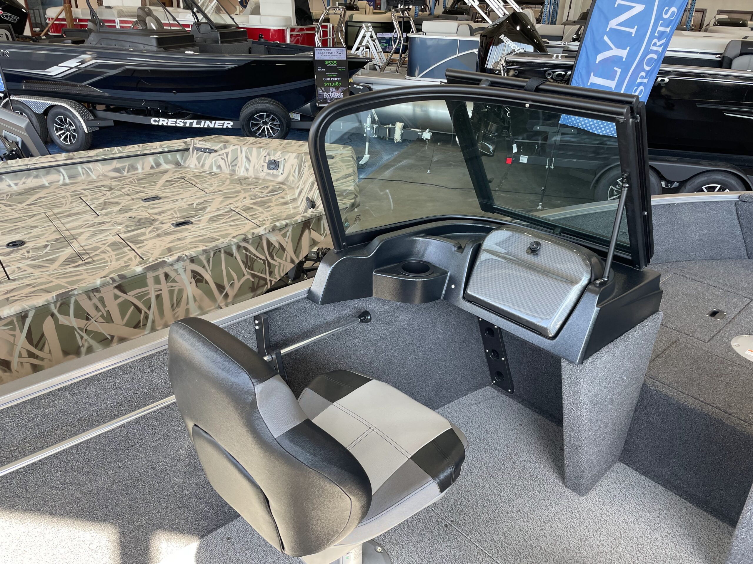 - Console, starboard, fiberglass reinforced w/lit toggle switches, drink holder, 12V power outlet, throw tray, & MP3 cubby