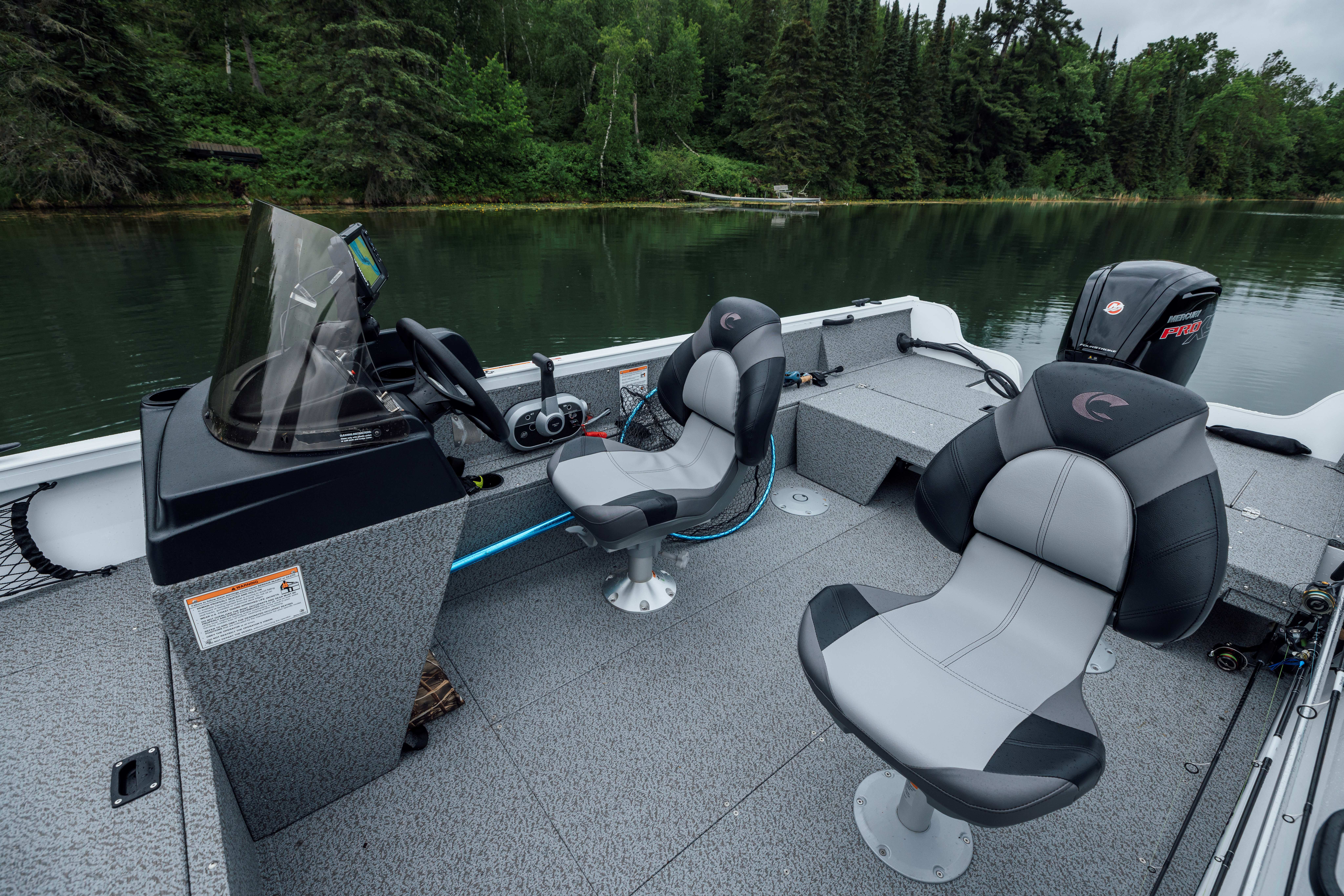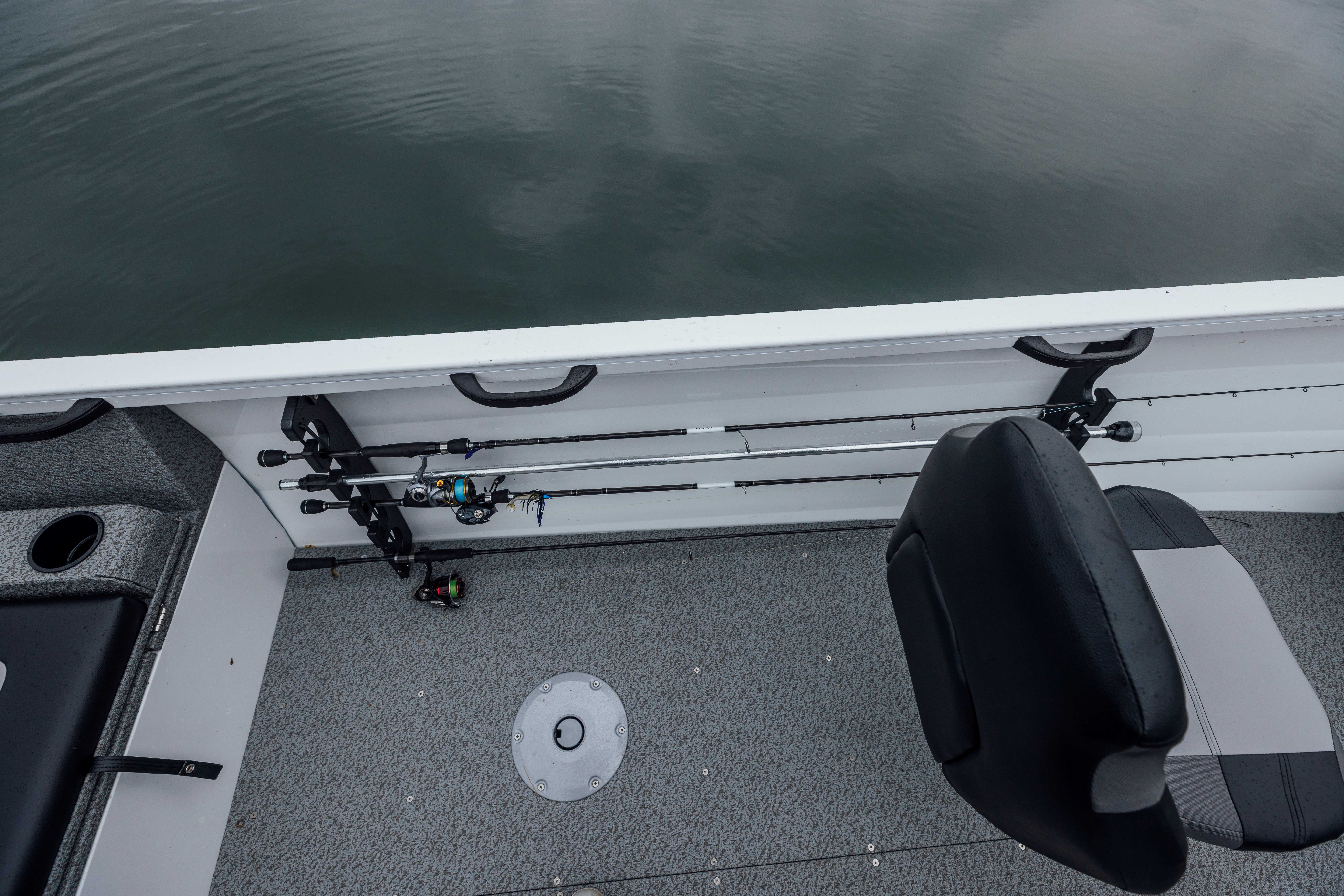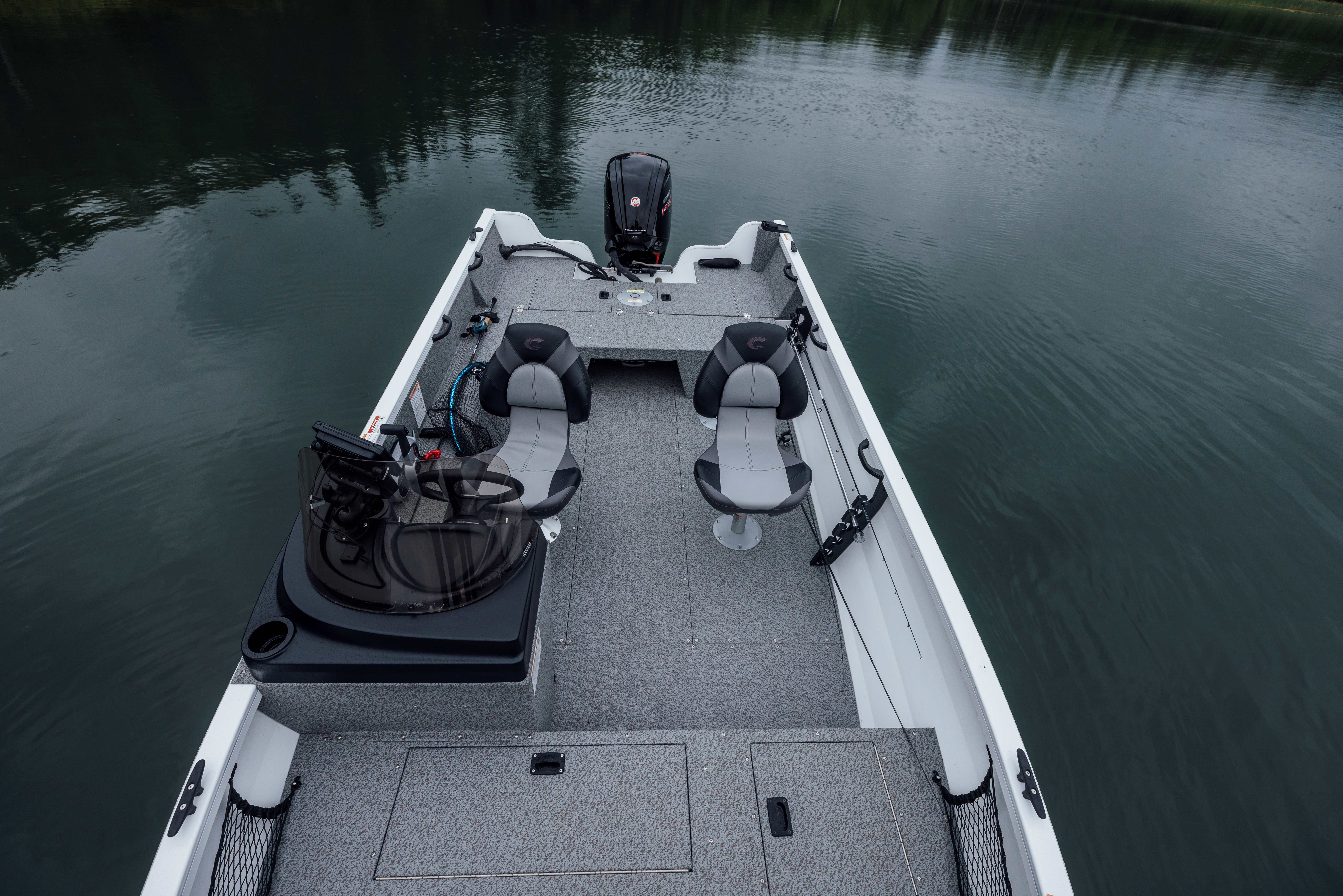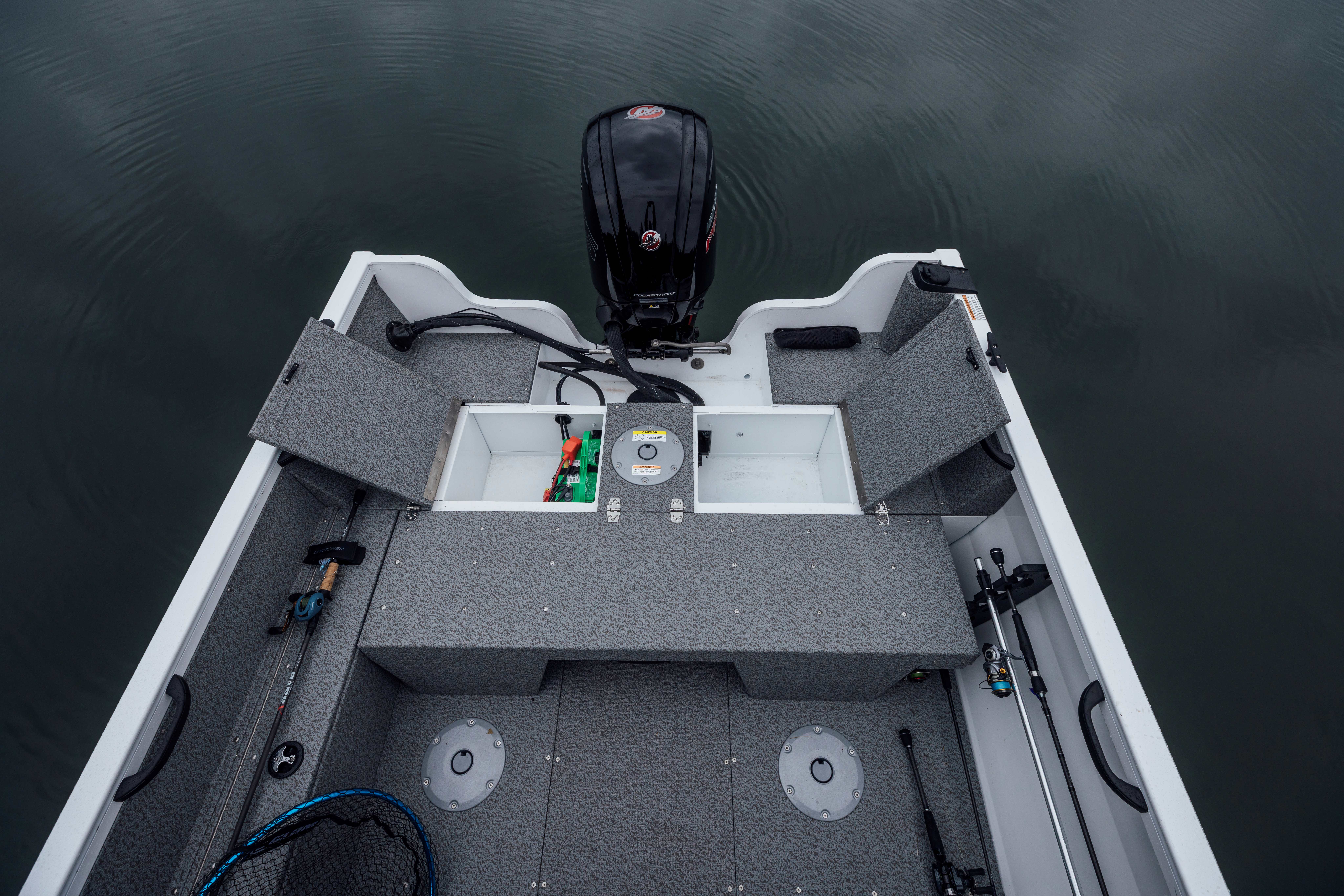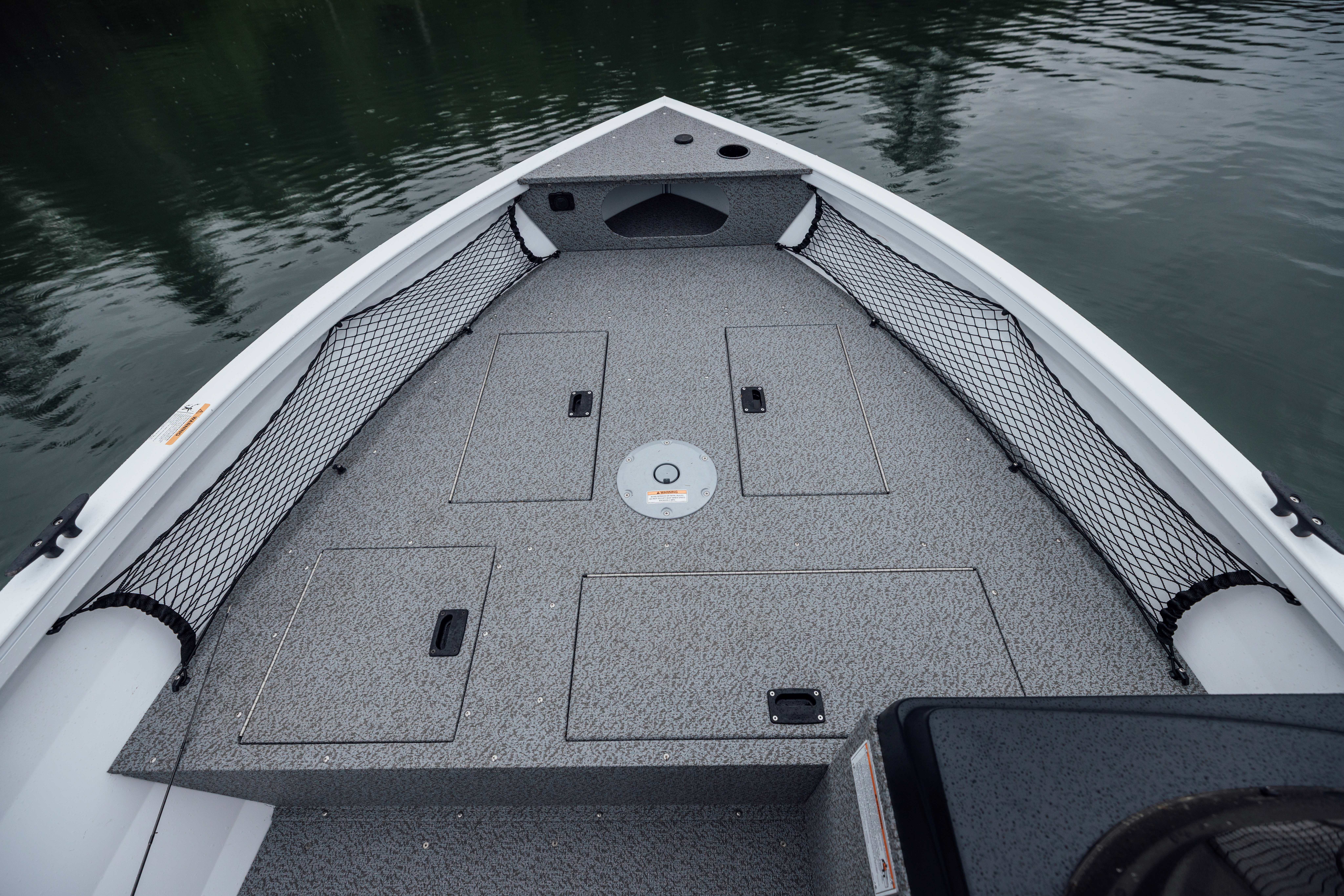 The bow features two storage compartments, a 24-V battery compartment and a 17-gal aerated livewell with bait bucket.