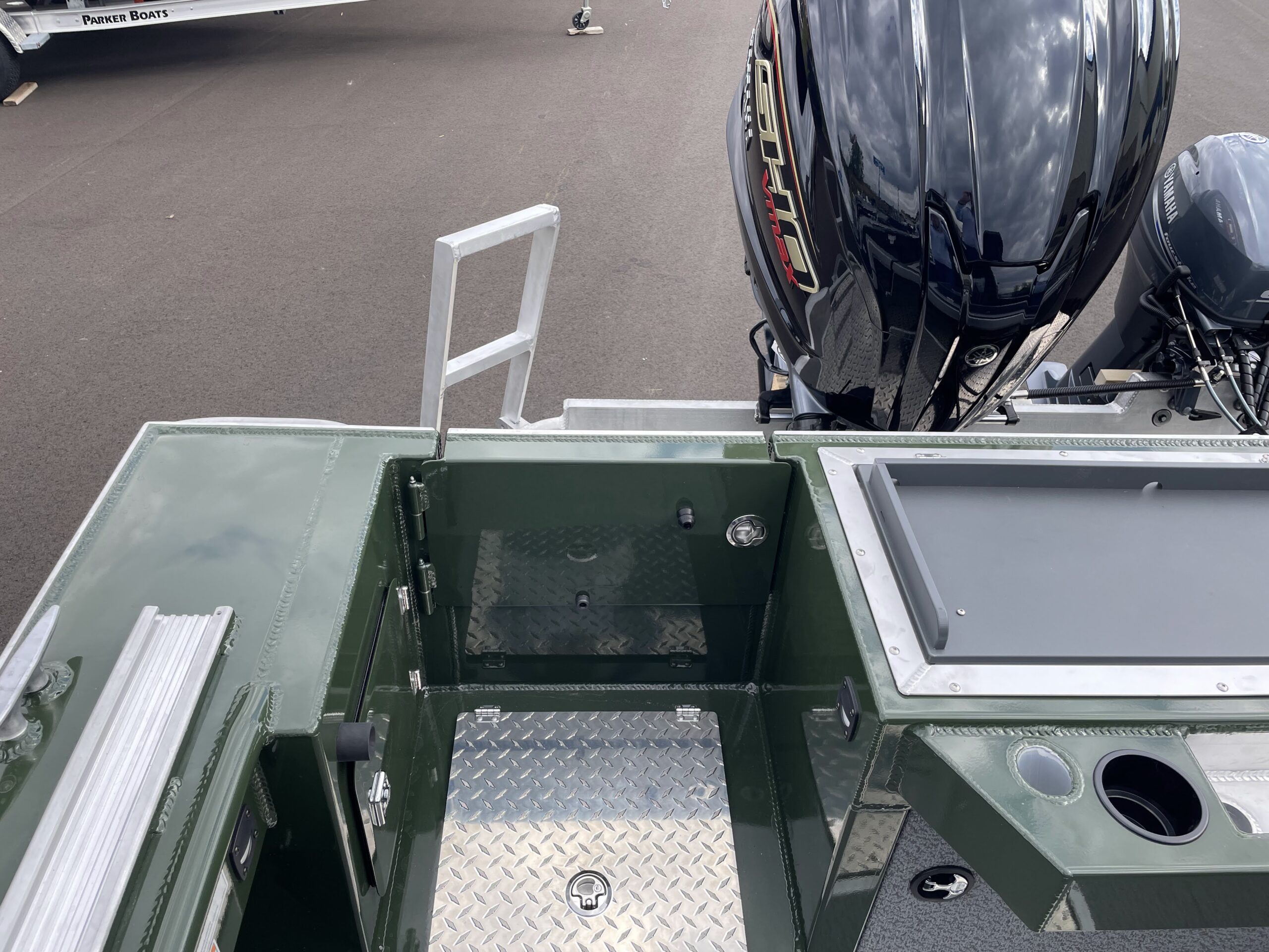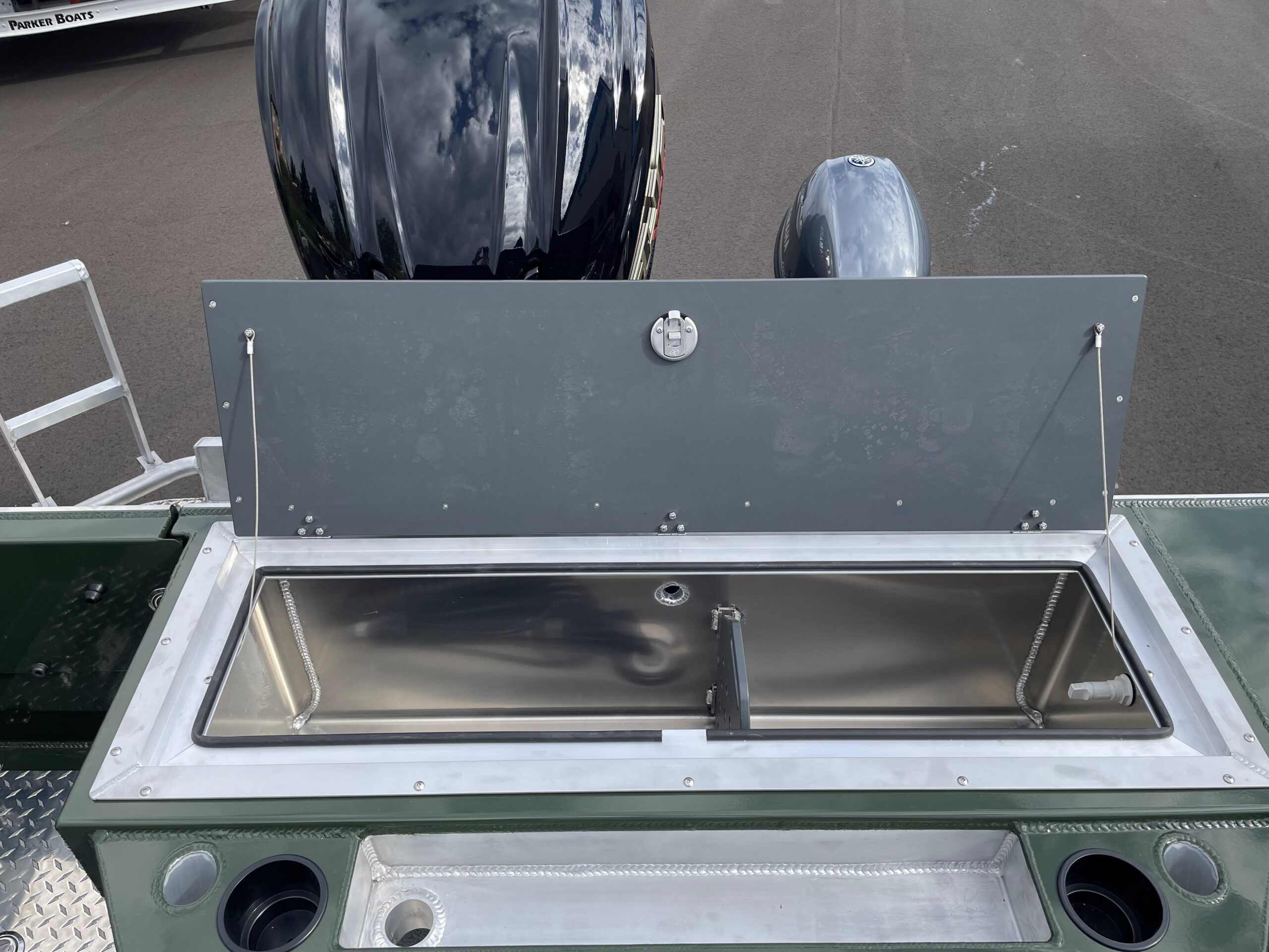 - Fish Box: 35 gallon in transom with cutting board lid