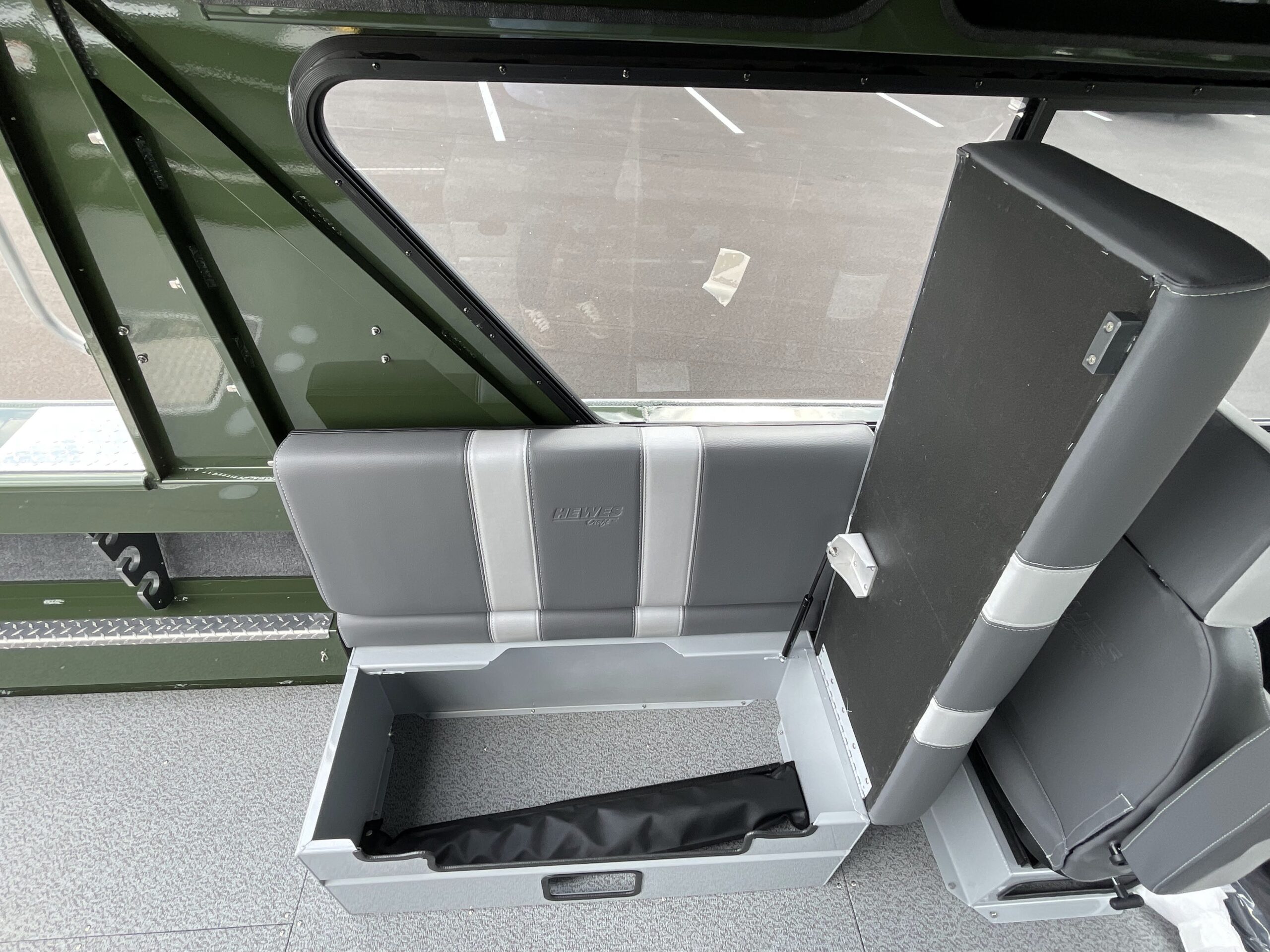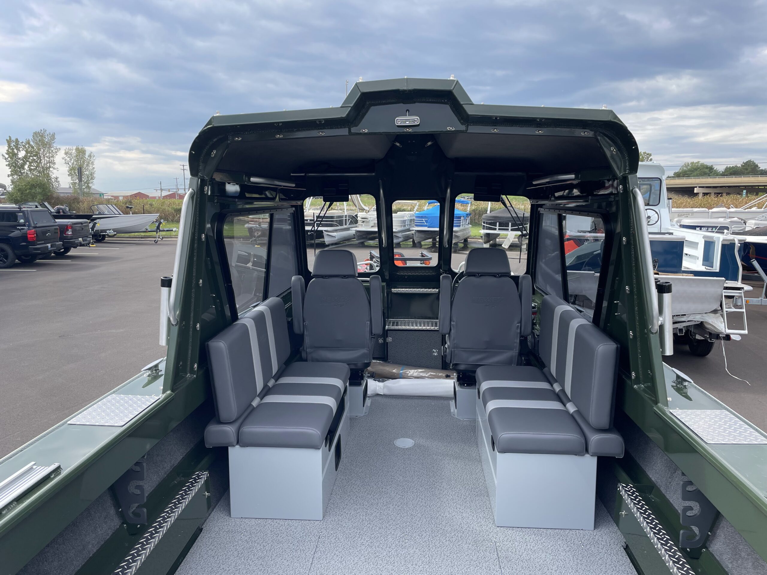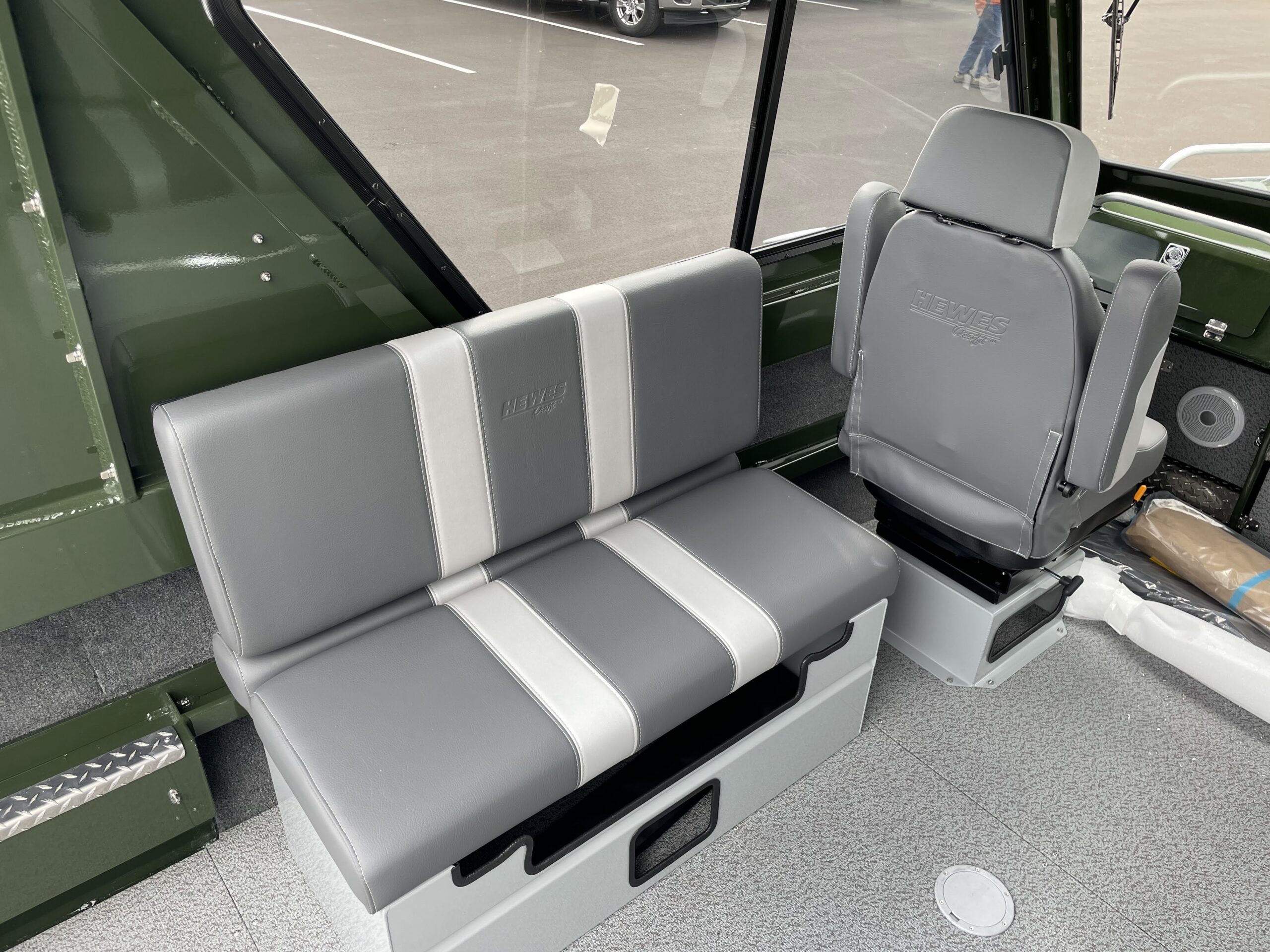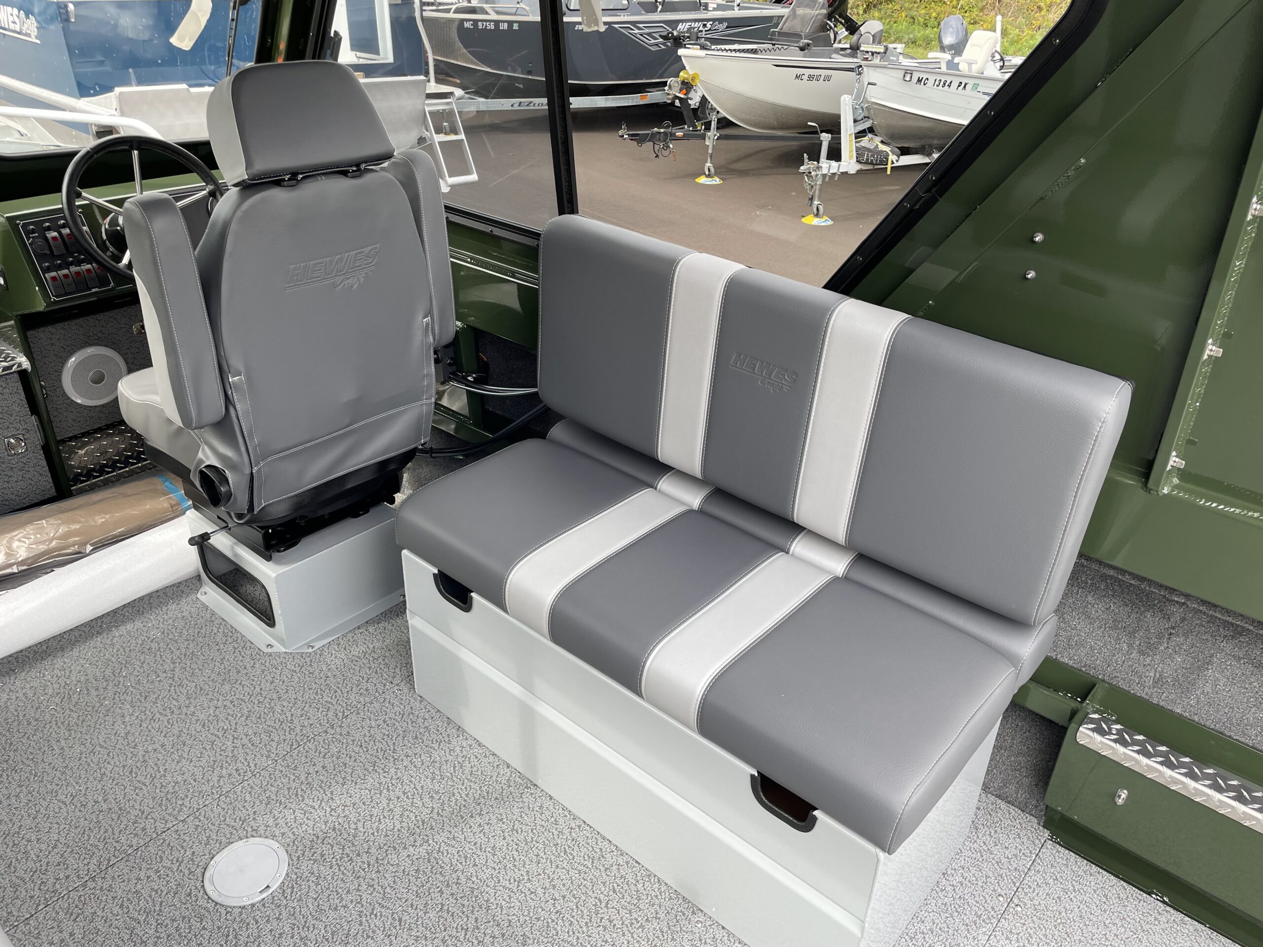 - Seats: High-back, dry box with lid, swivel, horseshoe suspension
