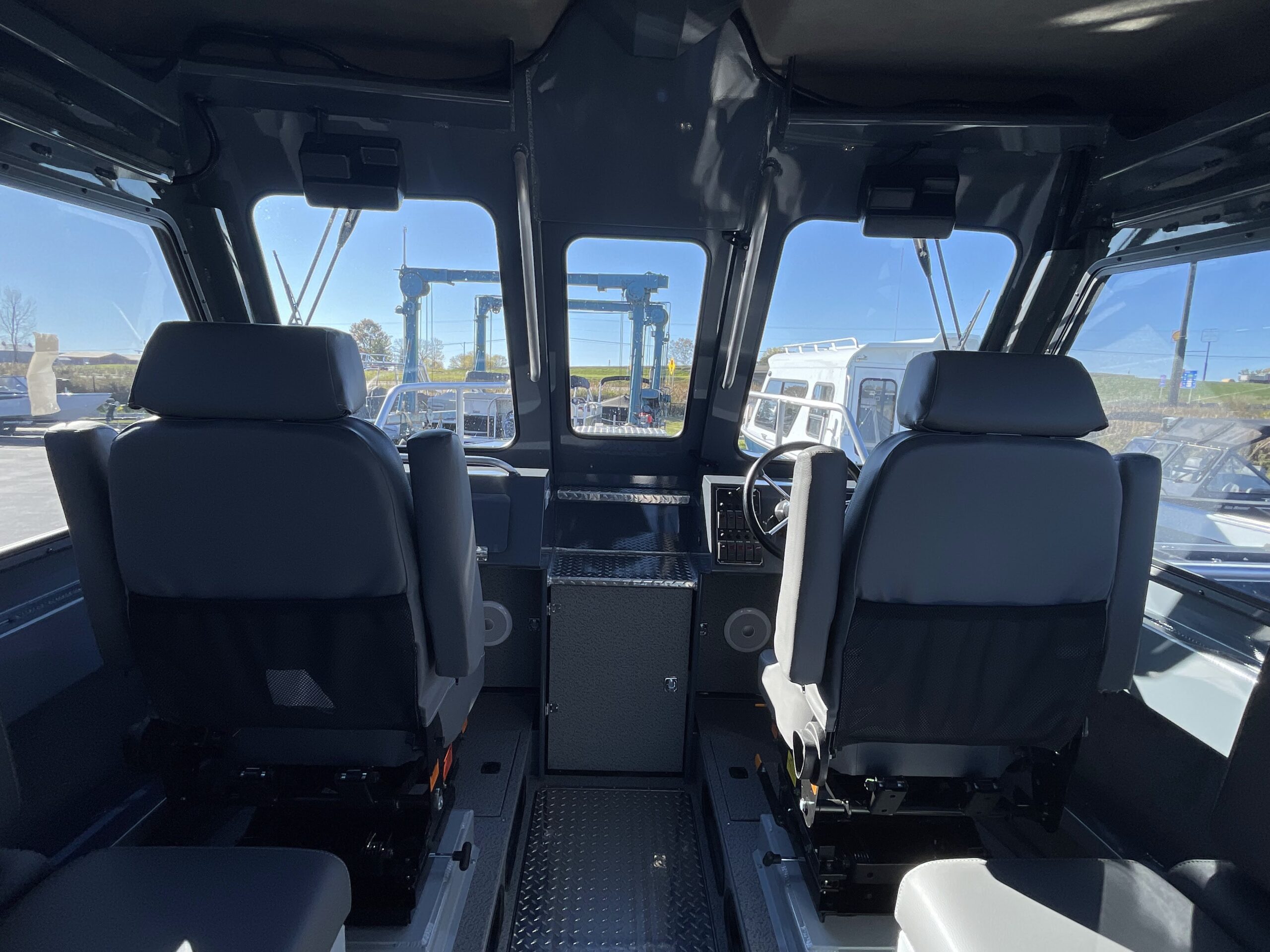 - Seat: Severe-duty captain’s chair with suspension, arm rests, and adjustable headrest